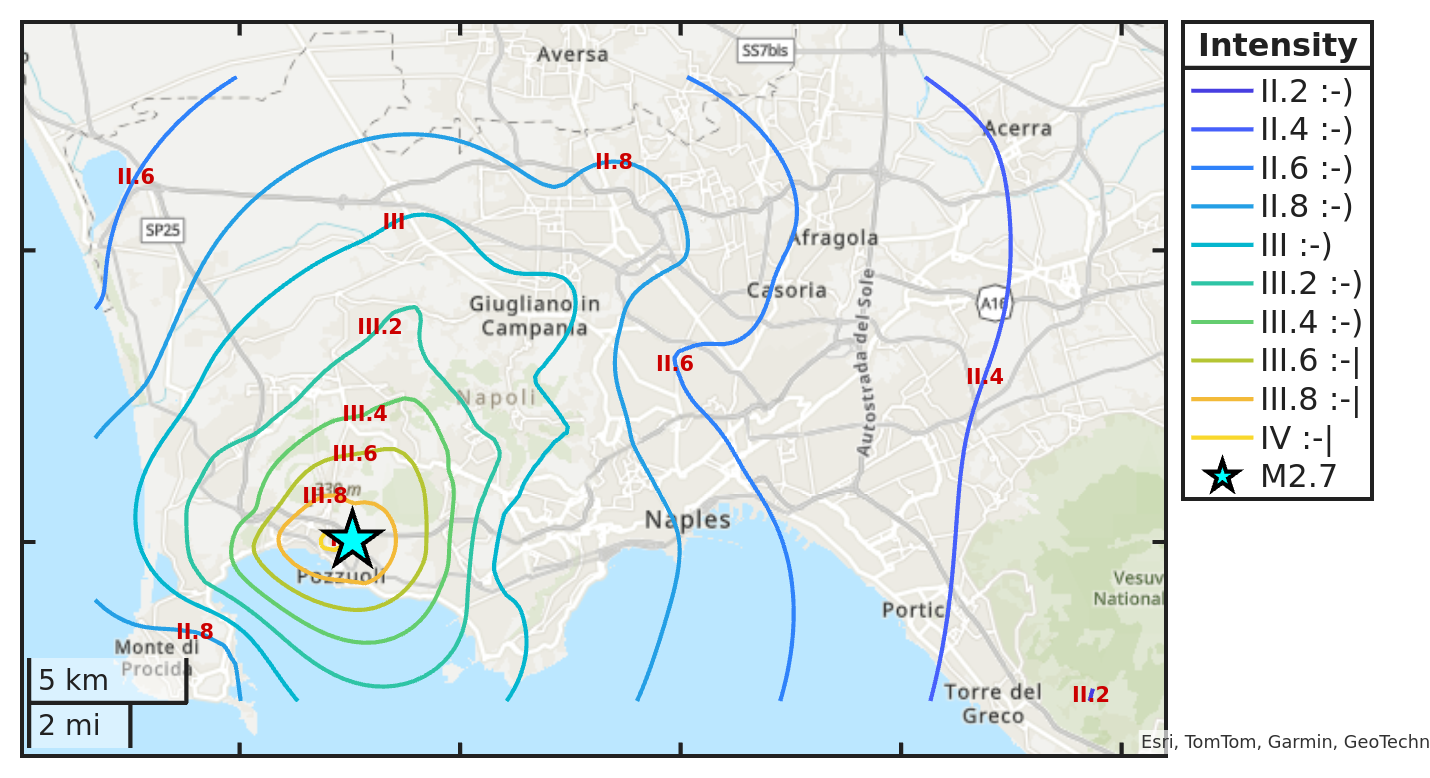 Mappa d’intensità per il sisma M2.7 avvenuto il 2/10/2025 alle 19:57:03 con epicentro nei Campi Flegrei. La mappa si basa su 310 segnalazioni inviate dagli utenti dell’app Rilevatore Terremoto che hanno percepito il sisma. L’intensità è espressa in scala Mercalli (con decimali trattandosi di interpolazione da modello).